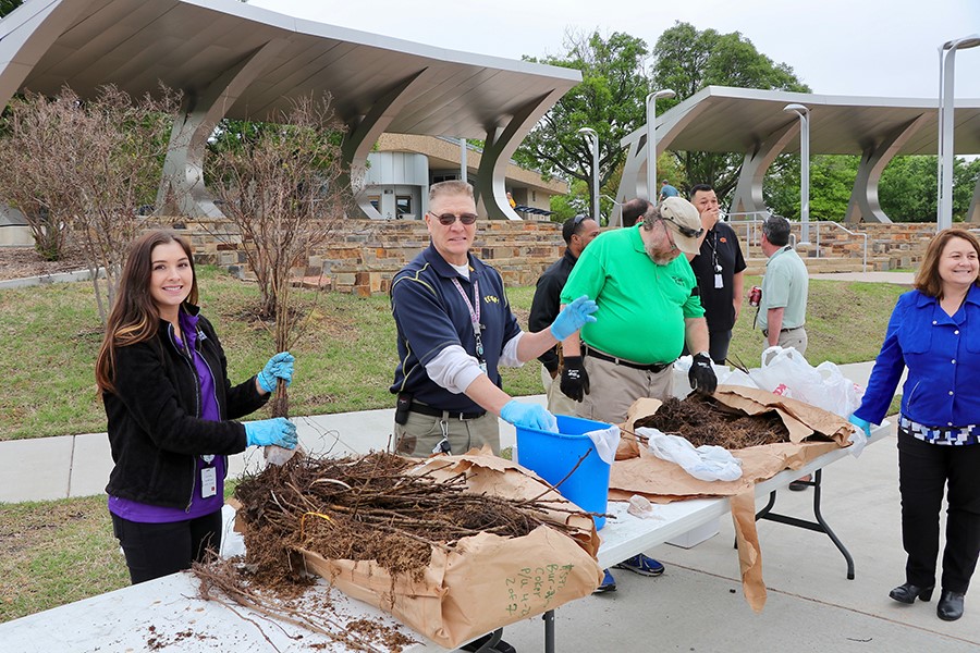 In addition to the other vendors, Foster Tree Care once again provided support to MMAC with saplings of redbud and bur oak trees that were paid for with recycling dollars. AMP-100 distributed 1,400 trees to employees. By planting these trees, the employees will be supporting a clean environment while also replenishing trees lost during ice storms in recent years. Trees promote clean air and provide oxygen by absorbing pollutant gases and filtering particulates out of the air by trapping them on their leaves and bark. Trees absorb carbon dioxide which helps combat greenhouse gas buildup by removing and storing the carbon while releasing oxygen back into the air. In one year an acre of mature trees can provide enough oxygen for 18 people, and absorb the amount of CO2 that a car produces after driving 26,000 miles. In addition, trees can help conserve energy. Three shade trees placed strategically around a single-family home can cut summer air conditioning needs by up to 50 percent. This reduces the energy demand for cooling our houses, which reduces carbon dioxide and other pollution emissions from power plants.