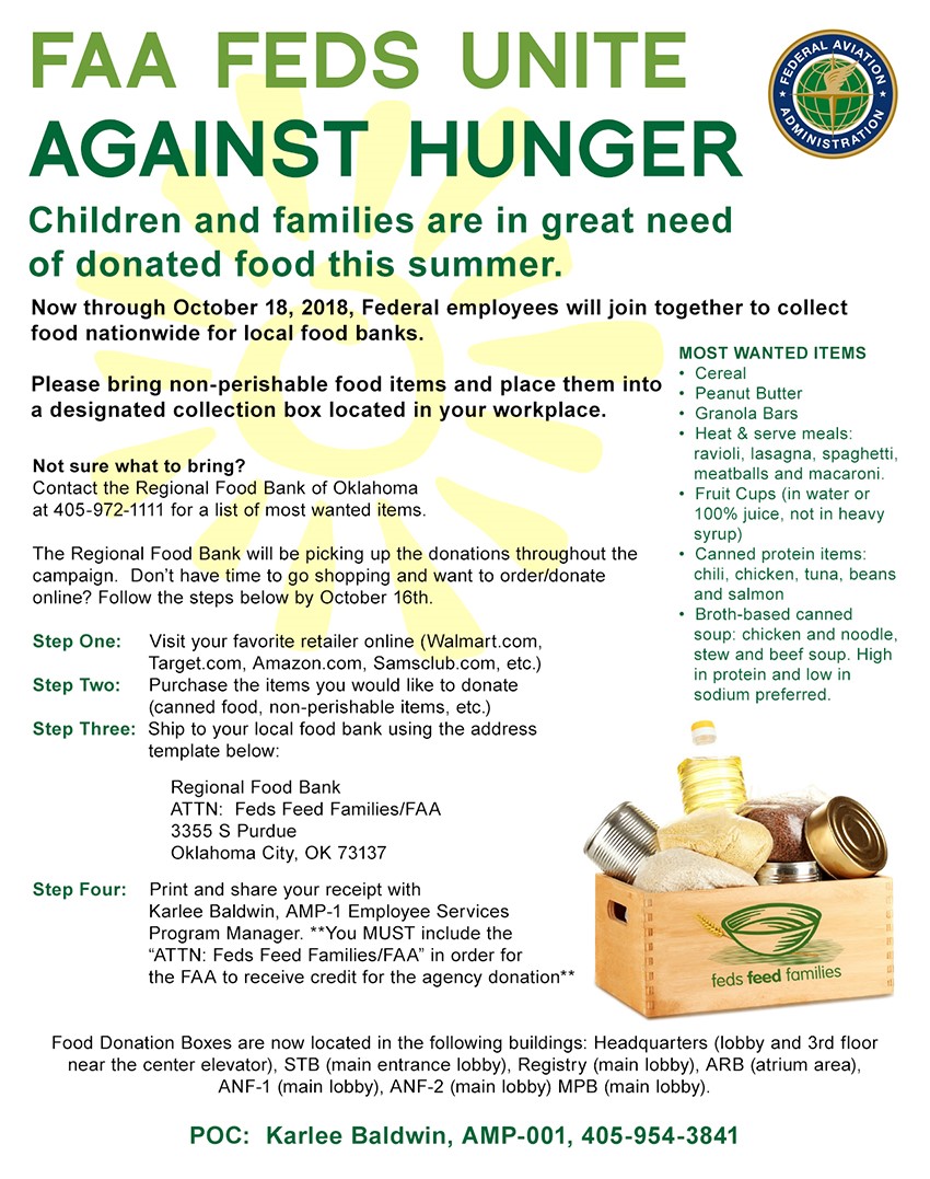 The Aeronautical Center is taking part in an agency-wide effort to support the “Feds Feeds Families” program. Here’s your chance to bring in non-perishable items, now through Thursday, October 18th and support the Regional Food Bank and our efforts to fight hunger. The Regional Food Bank will be picking up the donations throughout the campaign. The final MMAC collection will be on or around October 16th. However, online contributions will be accepted until October 18th.