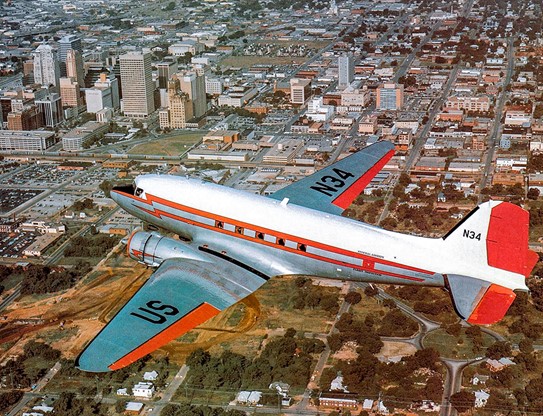 In December of 1985, an FAA DC-3 (registration number N-34) arrived at Washington National Airport to begin a new career as a flying exhibit. Manufactured in 1945, N-34 had belonged to the Navy before its transfer to FAA in 1963. With many other DC-3s, it performed quality assurance and facility certification checks on the nation's airways before its retirement from this role in September of 1982. N-34 was exhibited at air shows until it retired from active service as a cost saving measure in early 1994.