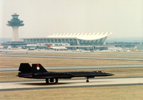 An SR-71 Blackbird reconnaissance aircraft landed at Dulles International airport after a record-breaking 68-minute flight from the Pacific coast on March 6th, 1990, and was then retired to the National Air and Space Museum collection.