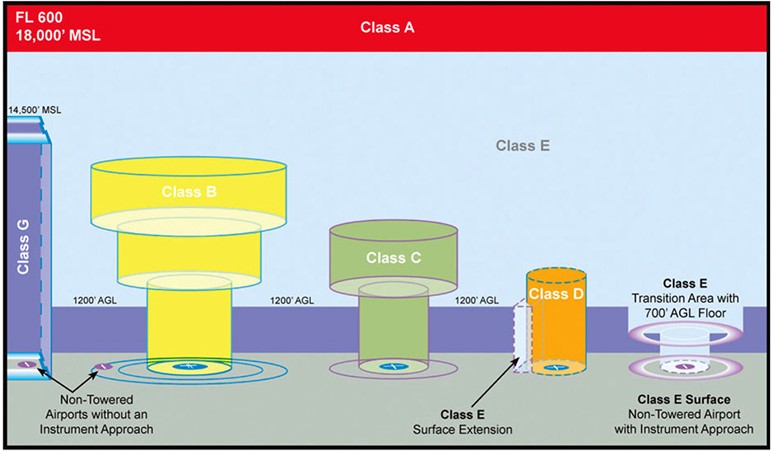 In December of 1991, the FAA published a rule to establish six classes of airspace designated by a single letter, in conformance with the recommendations of the International Civil Aviation Organization. The new designations and their equivalents under the existing system were: Class A (Positive Control Area); Class B (Terminal Control Area); Class C (Airport Radar Service Area); Class D (Airport Traffic Area, and Control Zone); Class E (General Controlled Airspace); and Class G (Uncontrolled Airspace). The new system became effective on September 16th, 1993.