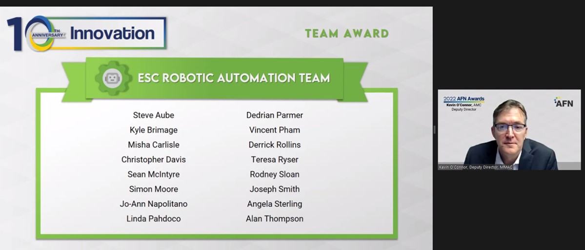 Next, The Enterprise Services Center’s Robotic Process Automation (RPA) Team received the Innovation Team Award. Steve Aube, Jo-Ann Napolitano, Rodney Sloan, Kyle Brimage, Linda Pahdoco, Joseph Smith, Misha Carlisle, Dedrian Parmer, Angela Sterling, Christopher Davis, Vincent Pham, Alan Thompson, Sean McIntyre, Derrick Rollins, Simon Moore, and Teresa Ryser embraced the momentum of government innovation initiatives in digital transformation using the latest agile software development processes, and new technologies such as Intelligent Automation. Embracing Intelligent Automation had a direct impact on employee engagement by advancing the exciting field of RPA across ESC operations. This team continues to build on their early successes and lessons learned. They have effectively created a standard, repeatable and secure RPA development process.