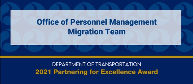 The Office of Personnel Management Migration Team won the Partnering for Excellence Award for their efforts to modernize the Office of Personnel Management’s Financial and Procurement systems, saving millions in taxpayer dollars. This transition was the culmination of 10 years of effort to modernize OPM’s financial management. The partnership between the DOT, OPM and ESC illustrated the cost benefits of the shared services business model. As a result, all of ESC’s 19 customers received a cost reduction in FY22.