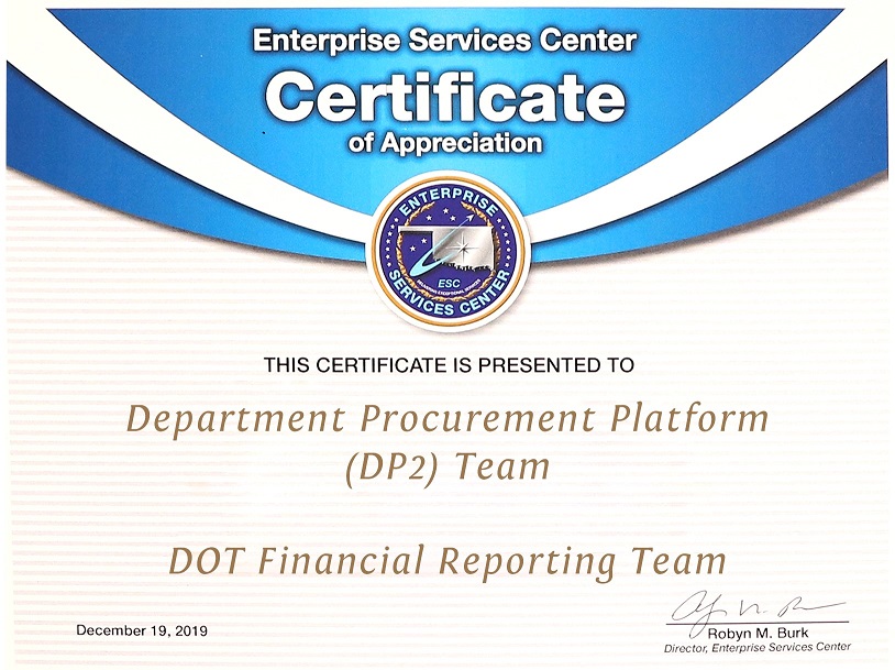 Mark House, Acting Assistant Administrator for Finance and Management (AFN) recognized the Department Procurement Platform (DP2) Team – (DOT Led) as the winner of the DOT Secretary’s Partnering for Excellence Award. Mark House noted, "The Enterprise Services Center (ESC) in OKC is a ’go to’ team, helping people balance their books. They were remarkable in consolidating eight legacy systems into one. They know how to standardize processes to meet agency requirements. Getting a clean audit is a long and weary road and it takes a lot of talent to collect tons of complex data and be able to explain it to auditors. They have succeeded in obtaining clean audits for 13 years in a row. ESC cut the number of Personal Identification Verification (PIV) licenses needed to gain access to those legacy systems, saving $450,000 in license fees and another $100,000 in maintenance fees. This is just one example of their ability to act as good stewards, using tax dollars appropriately."